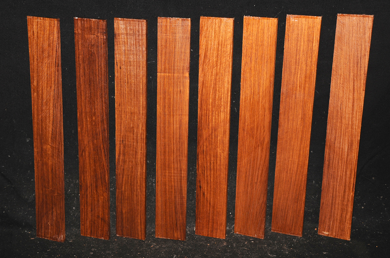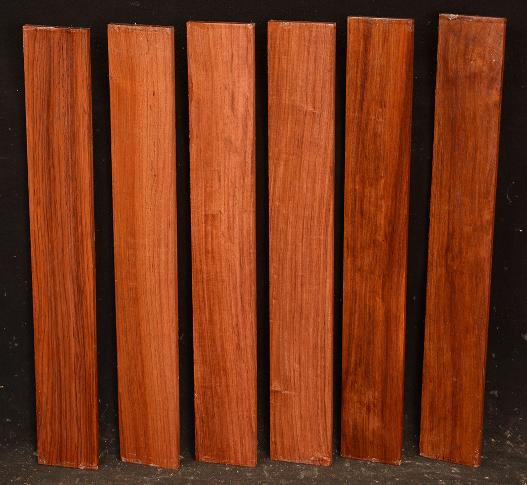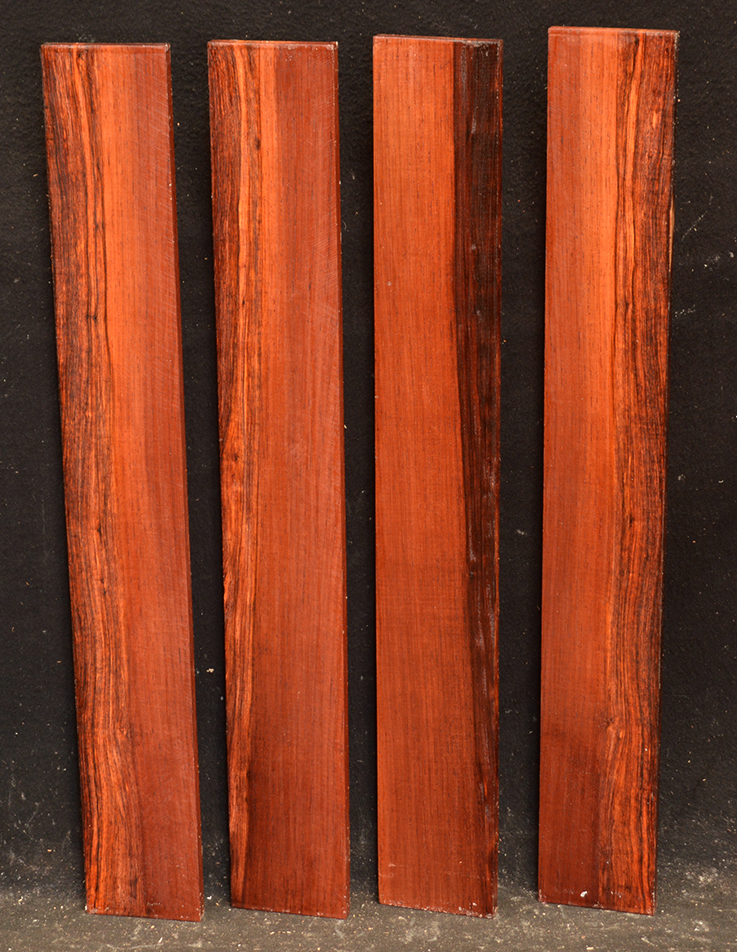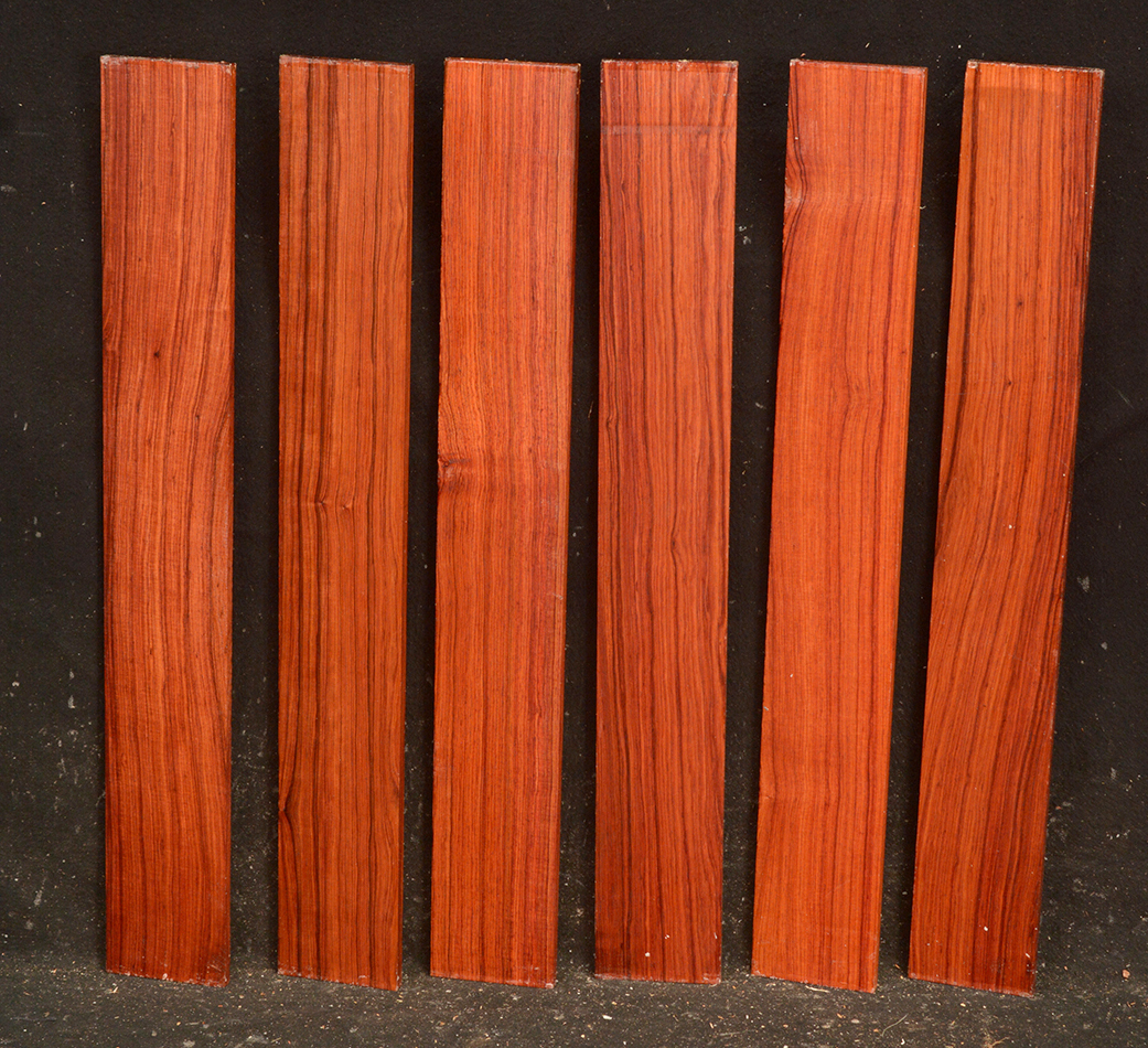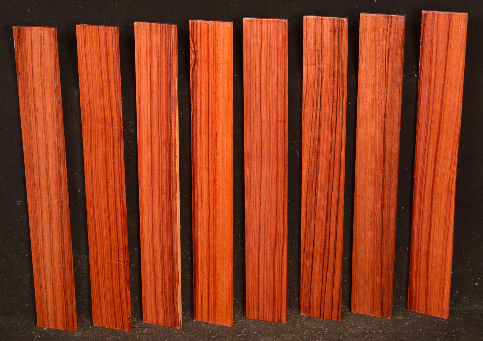 This rare Brazilian Tulipwood look-a-like is a true Dalbergia species and like many others in the genus it has flashy color, an aromatic smell, is fairly hard and heavy, and is very stable in use. These pieces were originally cut as bass guitar fingerboards, for which they are excellent, but they can also be used for box sides, drawer fronts, etc.