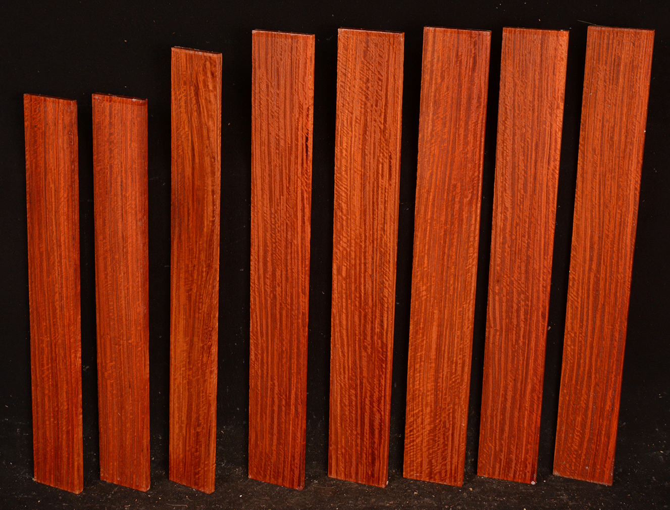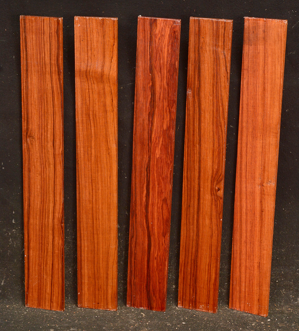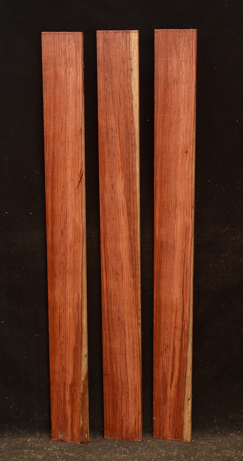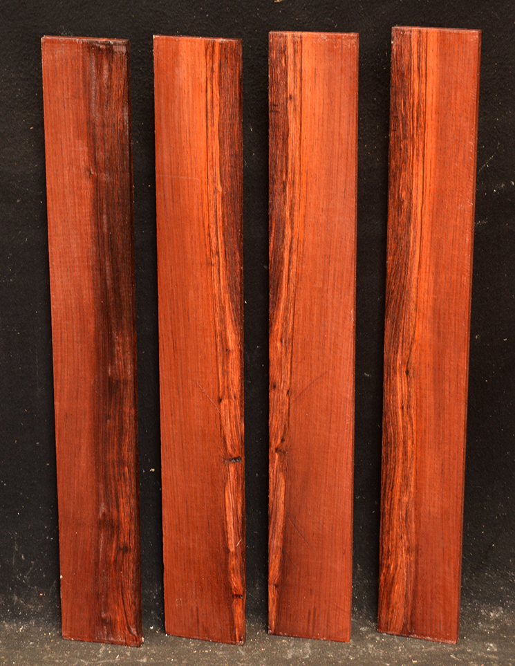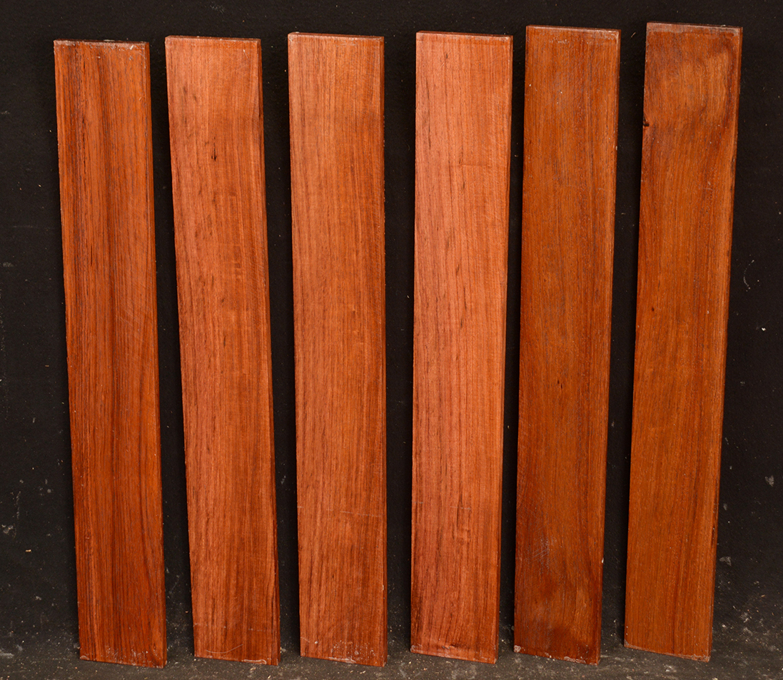 This rare Brazilian Tulipwood look-a-like is a true Dalbergia species and like many others in the genus it has flashy color, an aromatic smell, is fairly hard and heavy, and is very stable in use. These pieces were originally cut as bass guitar fingerboards, for which they are excellent, but they can also be used for box sides, drawer fronts, etc.