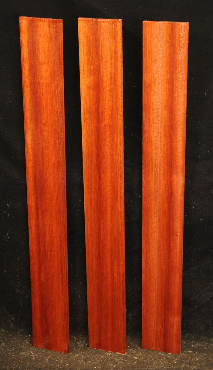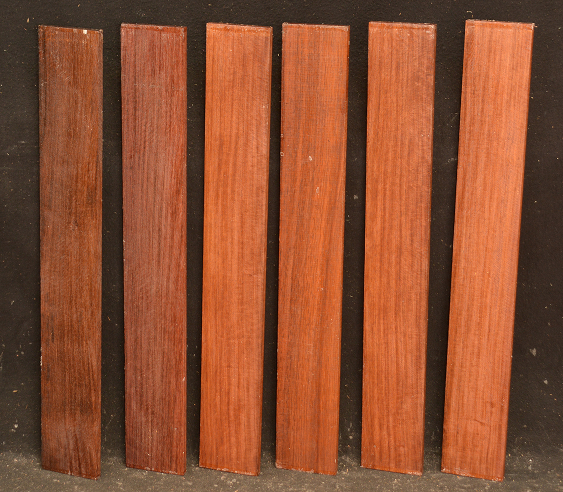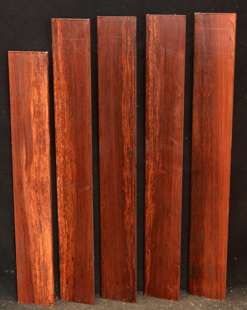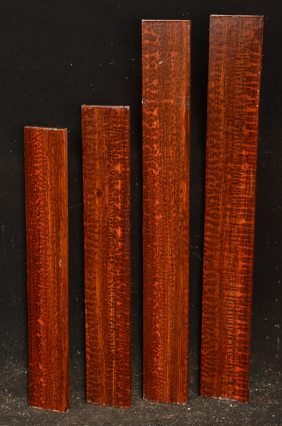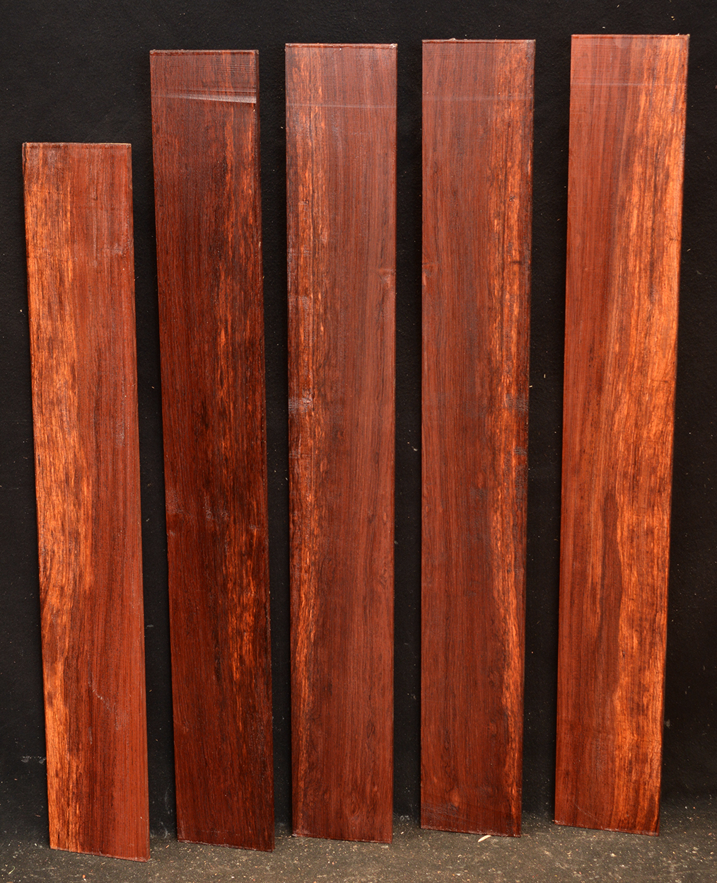 This rare Brazilian Tulipwood look-a-like is a true Dalbergia species and like many others in the genus it has flashy color, an aromatic smell, is fairly hard and heavy, and is very stable in use. These pieces were originally cut as bass guitar fingerboards, for which they are excellent, but they can also be used for box sides, drawer fronts, etc.