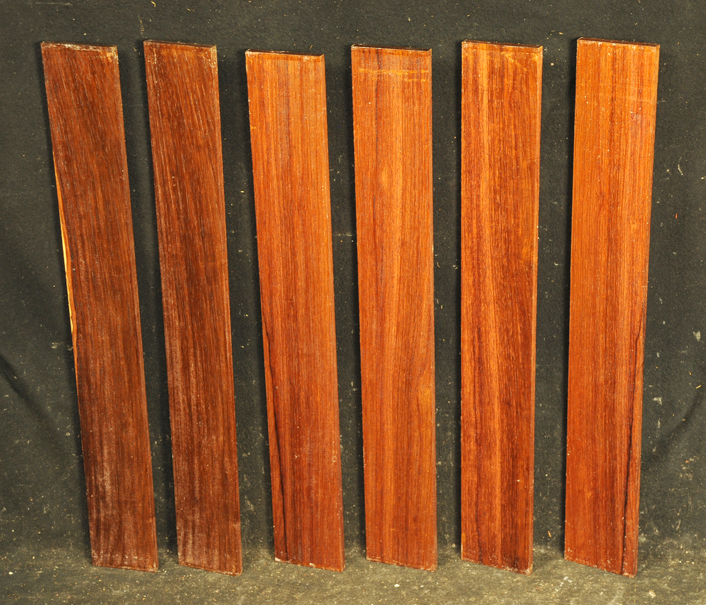 This rare Brazilian Tulipwood look-a-like is a true Dalbergia species and like many others in the genus it has flashy color, an aromatic smell, is fairly hard and heavy, and is very stable in use. These pieces were originally cut as guitar fingerboards, for which they are excellent, but they can also be used for box sides, drawer fronts, etc.